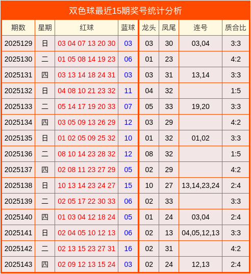 开奖回顾:双色球第2025143期奖号:02、09、12、13、15、24+03。其中龙头为02,凤尾为24,质合比为2:4,开出1组连号12,13。