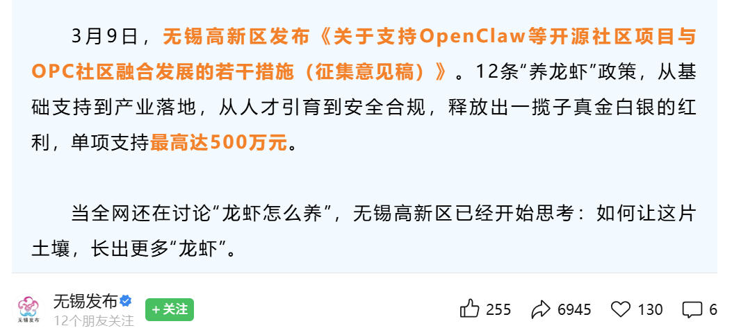 3月9日,无锡高新区发布《关于支持OpenClaw等开源社区项目与OPC社区融合发展的若干措施(征求意见稿)》,即“养龙虾十二条”,从基础支持到产业落地,从人才引育到安全合规,释放出一揽子真金白银的红利,单项支持最高达500万元。。